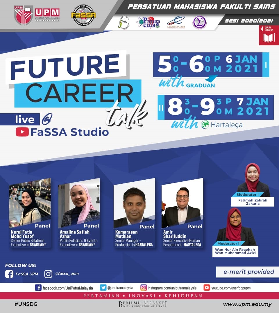 SERDANG, March 17 – Faculty of Science Students’ Association (FaSSA) 2020/2021 of the Faculty of Science, Universiti Putra Malaysia (UPM) has organized an educational programme, named Future Career Talk 2021 (FCT2021), with the aim to equip students with the right knowledge and skills related their respective chosen future career.