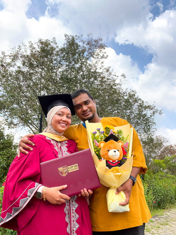 Usaha beliau menyiapkan tugasan dirasakan sangat berbaloi apabila berjaya memegang ijazah kedua beliau semasa Majlis konvokesyen UPM ke-45.