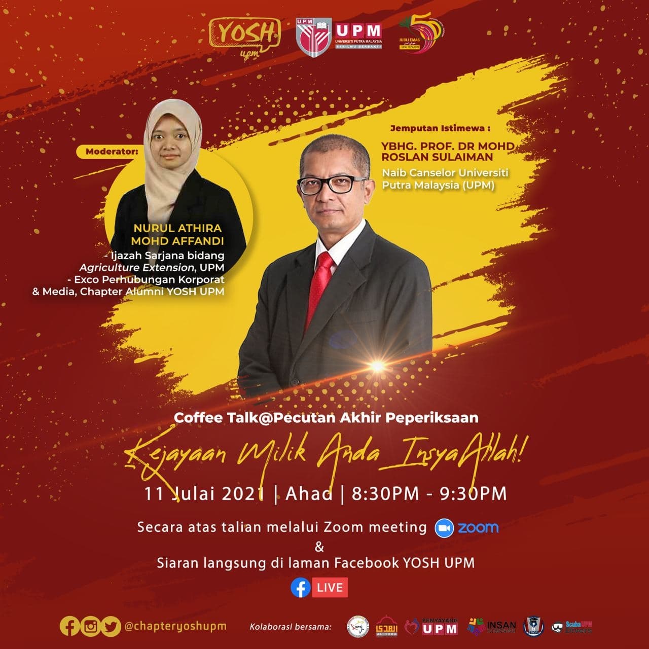 SERDANG, July 11 – Concerned over the mental health and online learning issues, the Chapter Alumni YOSH UPM has taken the initiative to hold a casual talk session, Coffee Talk with UPM Vice-Chancellor, Prof. Dr. Mohd Roslan Sulaiman.